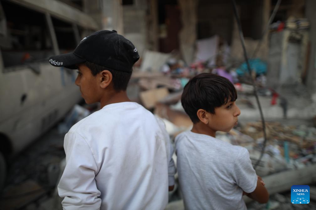 Palestinian boys stand in front of the rubble in the Al-Maghazi refugee camp in the central Gaza Strip, on June 5, 2024. At least 75 Palestinians were killed in Israeli overnight attacks on several areas in the central Gaza Strip, Palestinian sources said on Wednesday. Security sources told Xinhua that Israeli aircraft and artillery bombed several locations overnight in the Al-Bureij and Al-Maghazi refugee camps and east of Deir al-Balah in central Gaza. (Photo by Marwan Daoud/Xinhua)