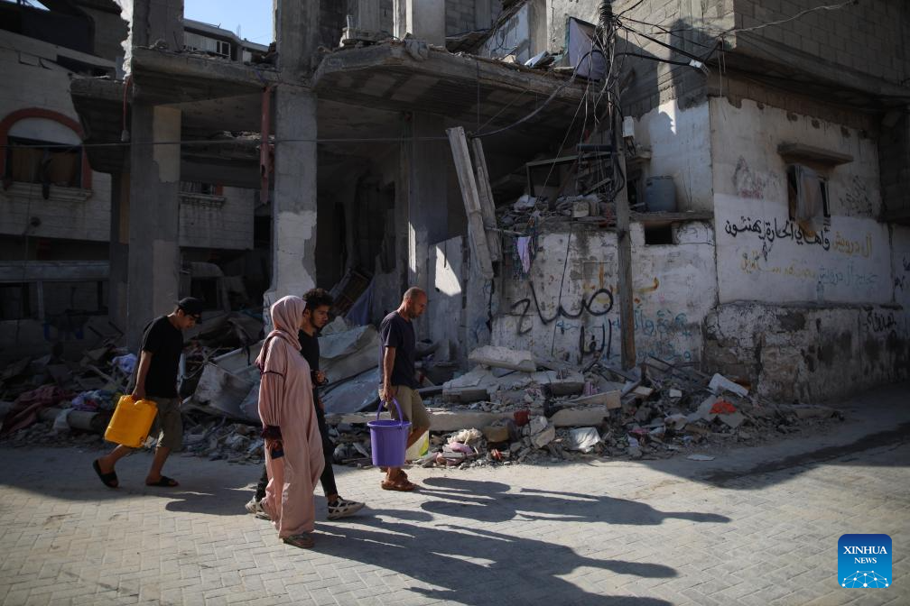 Palestinians walk past a destroyed building in the Al-Maghazi refugee camp in the central Gaza Strip, on June 5, 2024. At least 75 Palestinians were killed in Israeli overnight attacks on several areas in the central Gaza Strip, Palestinian sources said on Wednesday. Security sources told Xinhua that Israeli aircraft and artillery bombed several locations overnight in the Al-Bureij and Al-Maghazi refugee camps and east of Deir al-Balah in central Gaza. (Photo by Marwan Daoud/Xinhua)