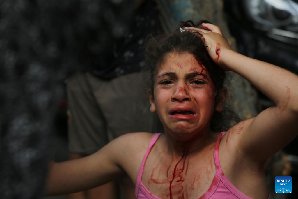 An injured girl cries after an Israeli attack in the Al-Maghazi refugee camp in central Gaza, on June 5, 2024. At least 75 Palestinians were killed in Israeli overnight attacks on several areas in the central Gaza Strip, Palestinian sources said on Wednesday. Security sources told Xinhua that Israeli aircraft and artillery bombed several locations overnight in the Al-Bureij and Al-Maghazi refugee camps and east of Deir al-Balah in central Gaza. (Photo by Marwan Daoud/Xinhua)