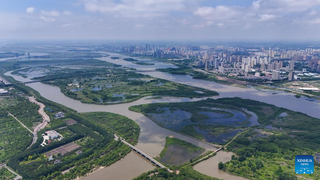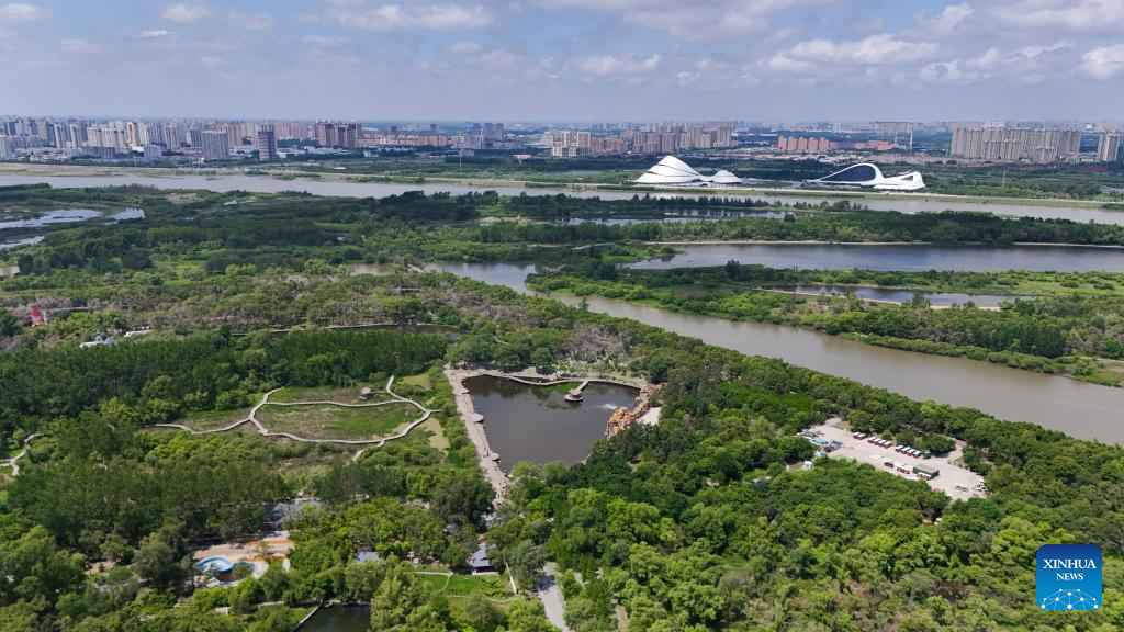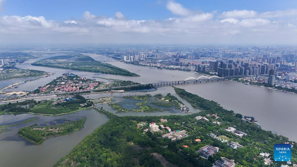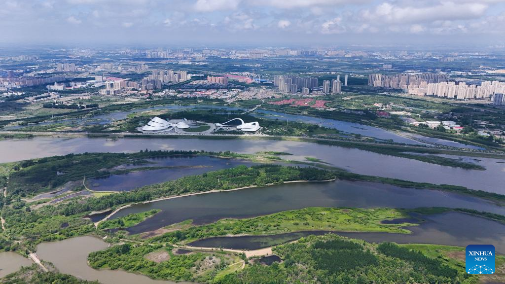 An aerial drone photo taken on June 4, 2024 shows a view of Heilongjiang Taiyangdao National Wetland Park and city view in Harbin, northeast China's Heilongjiang Province. (Xinhua/Wang Song)
