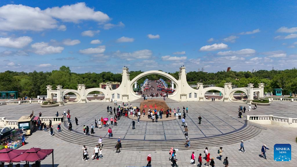An aerial drone photo taken on June 4, 2024 shows people visiting Heilongjiang Taiyangdao National Wetland Park in Harbin, northeast China's Heilongjiang Province. (Xinhua/Wang Song)