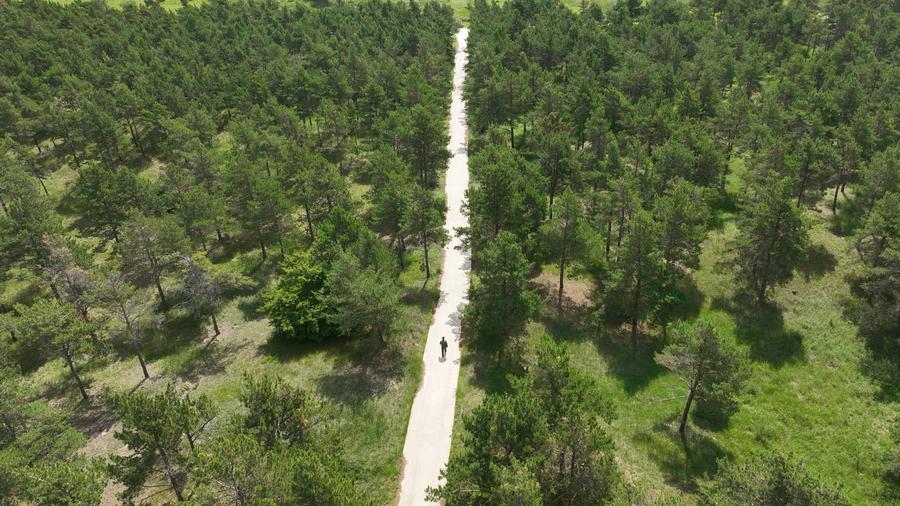An aerial drone photo shows Li Dongkui partroling the forest in Zhangwu County, northeast China's Liaoning Province, May 31, 2024. (Xinhua/Yang Qing)