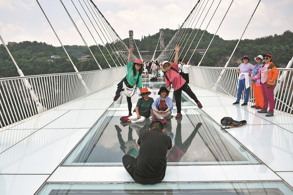 Tourists from South Korea pose for a photo on a glass bridge in Zhangjiajie Scenic Area in Hunan province in May. CHEN ZHENHAI/XINHUA