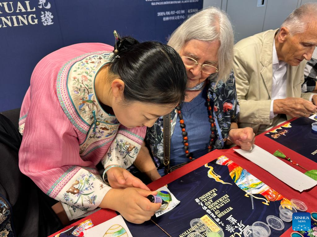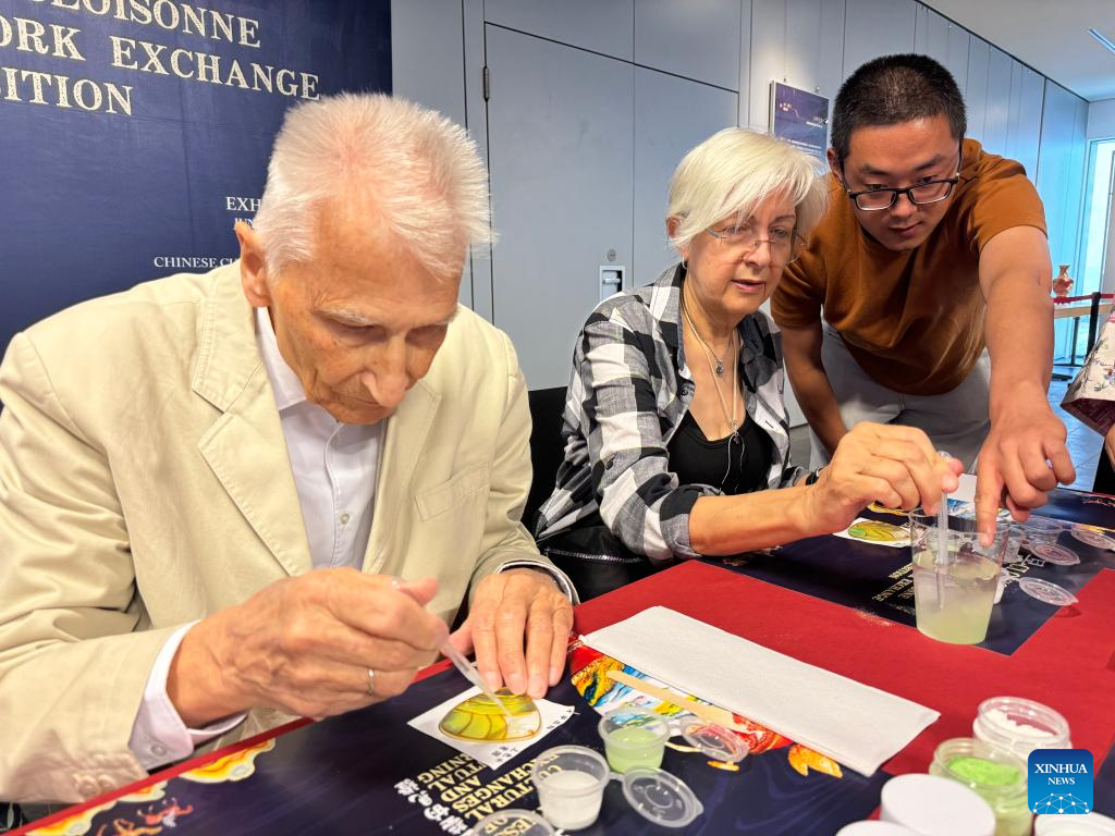 Guests learn to make enamel ornaments at the China Cultural Center during an exchange exhibition on Chinese cloisonne in Berlin, Germany, June 6, 2024. (Xinhua/Tai Sicong)