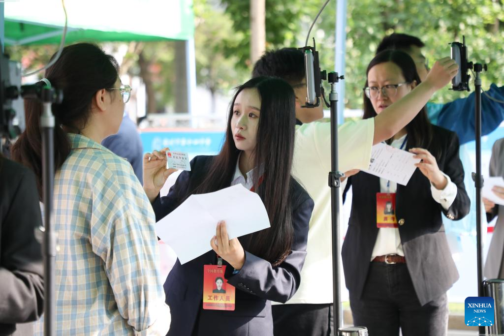 Examinees have their identity cards checked before entering a national college entrance examination site in Lanzhou, northwest China's Gansu Province, June 7, 2024. China's national college entrance examination, known as the Gaokao, started on Friday. (Xinhua/Ma Xiping)