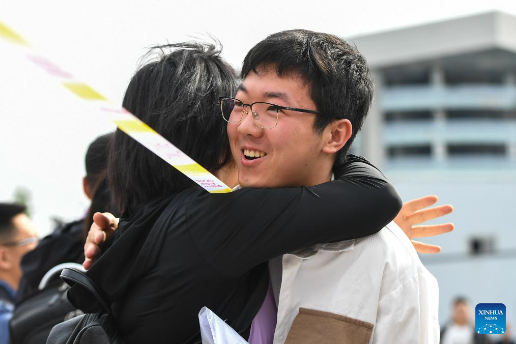 An examinee hugs his teacher before entering a national college entrance examination site in Changchun, northeast China's Jilin Province, June 7, 2024. China's national college entrance examination, known as the Gaokao, started on Friday. (Xinhua/Zhang Nan)