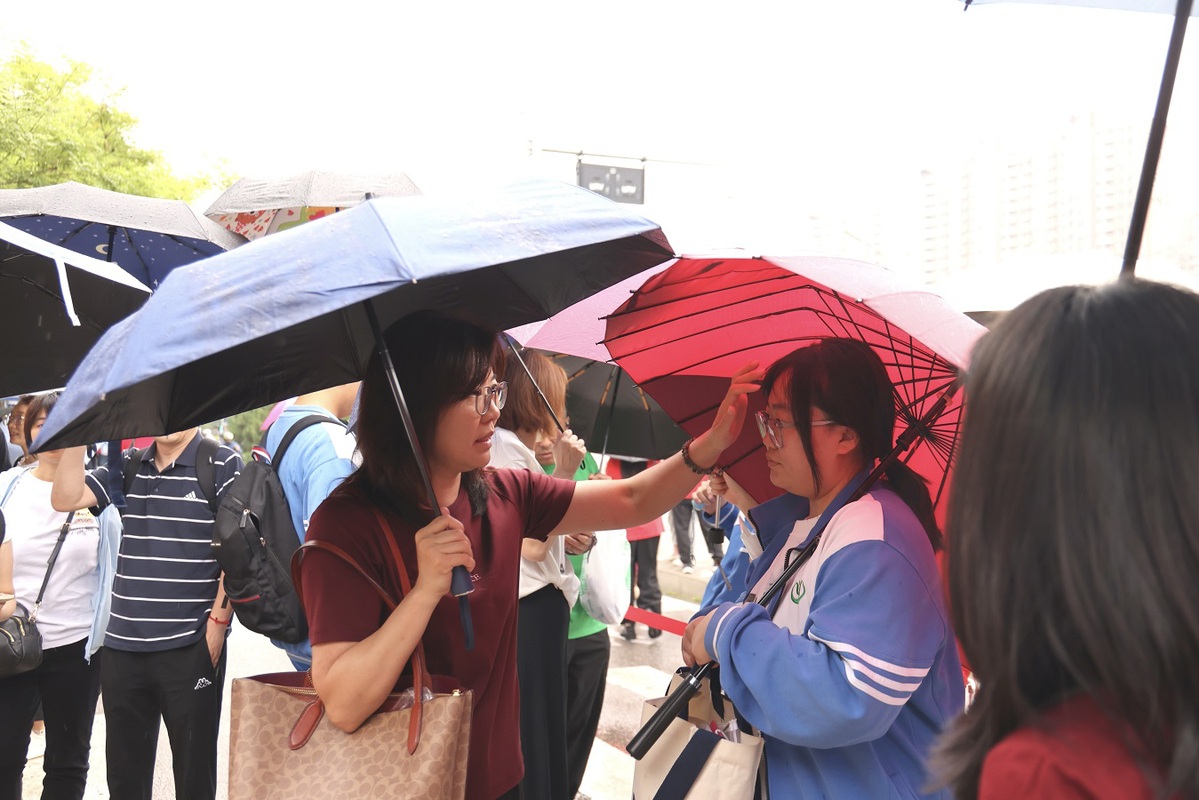 A mother encourages her daughter before the start of her national college entrance examination, or gaokao, at the Chaoyang Campus of High School Affiliated to Renmin University on June 7, 2024. [Photo by Wang Jing/chinadaily.com.cn]