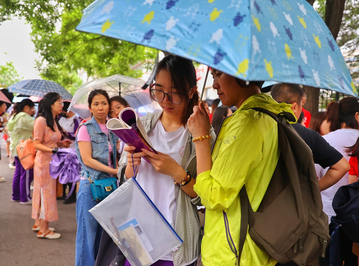 Parents wait expectantly outside the Wangjing Campus of Beijing No 80 High School on June 7, 2024. [Photo by Jiang Dong/chinadaily.com.cn]