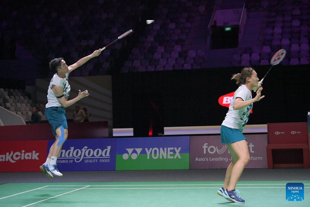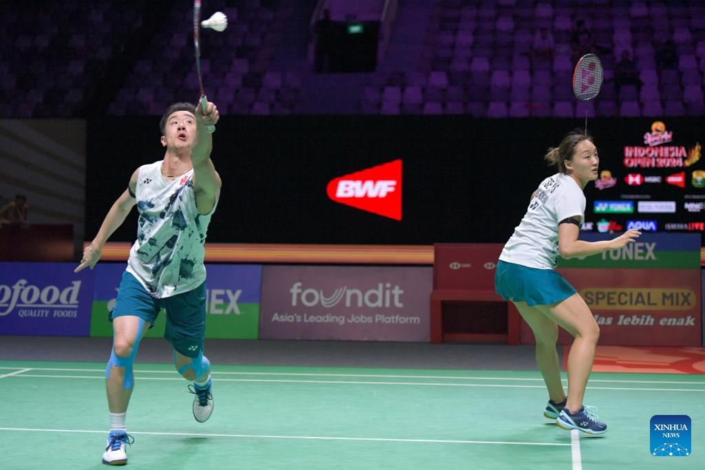 Tang Chun Man (L)/Tse Ying Suet compete during the mixed doubles quarterfinal match between Zheng Siwei/Huang Yaqiong of China and Tang Chun Man/Tse Ying Suet of China's Hong Kong at 2024 Indonesia Open badminton tournament in Jakarta, Indonesia, June 7, 2024. (Xinhua/Xu Qin)