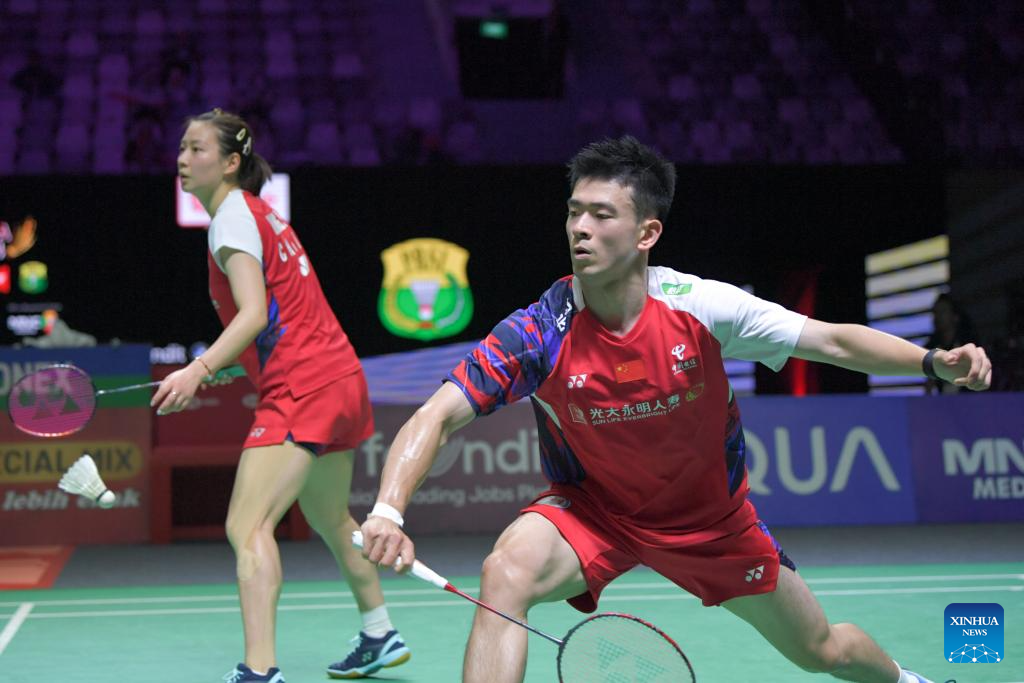 Zheng Siwei (R)/Huang Yaqiong compete during the mixed doubles quarterfinal match between Zheng Siwei/Huang Yaqiong of China and Tang Chun Man/Tse Ying Suet of China's Hong Kong at 2024 Indonesia Open badminton tournament in Jakarta, Indonesia, June 7, 2024. (Xinhua/Xu Qin)