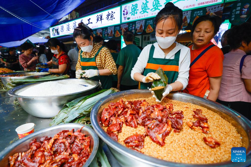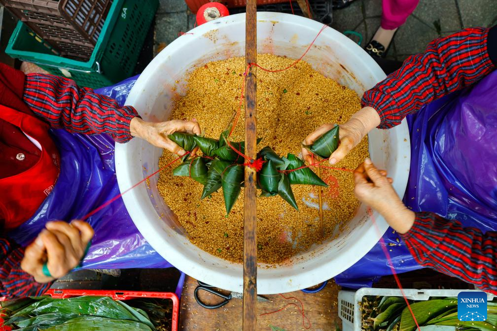 Staff members make Zongzi, a traditional Chinese food to mark the Dragon Boat Festival, at a shop in a market in Chengdu, southwest China's Sichuan Province, June 7, 2024. (Xinhua/Shen Bohan)