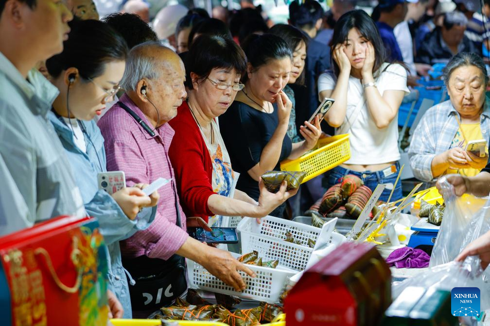 People shop for Zongzi, a traditional Chinese food to mark the Dragon Boat Festival, at a market in Chengdu, southwest China's Sichuan Province, June 7, 2024.?(Xinhua/Shen Bohan)