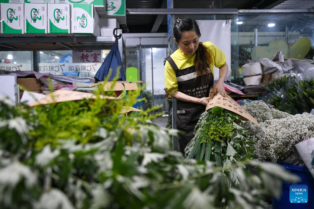 A shop owner arranges bundles of mugwort for the Dragon Boat Festival at a flower shop in Chengdu, southwest China's Sichuan Province, June 6, 2024. (Xinhua/Xu Bingjie)