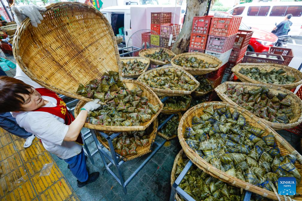 A staff member arranges bundles of freshly-made Zongzi, a traditional Chinese food to mark the Dragon Boat Festival, at a shop in a market in Chengdu, southwest China's Sichuan Province, June 7, 2024.?(Xinhua/Shen Bohan)