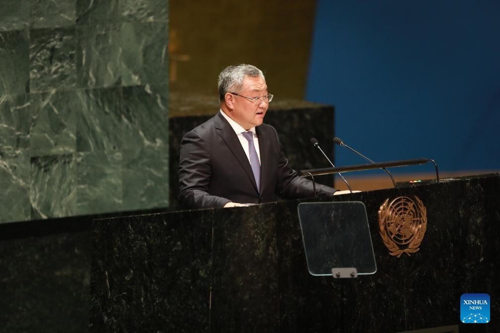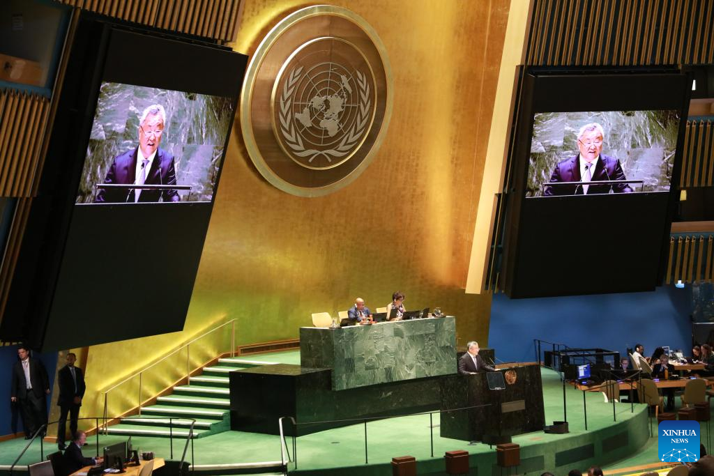 Fu Cong, China's permanent representative to the United Nations, introduces a draft resolution to establish the International Day for Dialogue among Civilizations at the UN General Assembly plenary session at the UN headquarters in New York, on June 7, 2024. (Xinhua/Xie E)