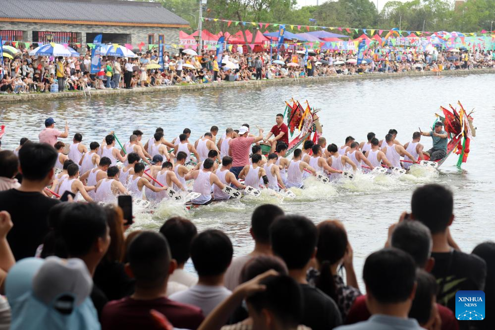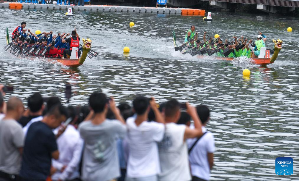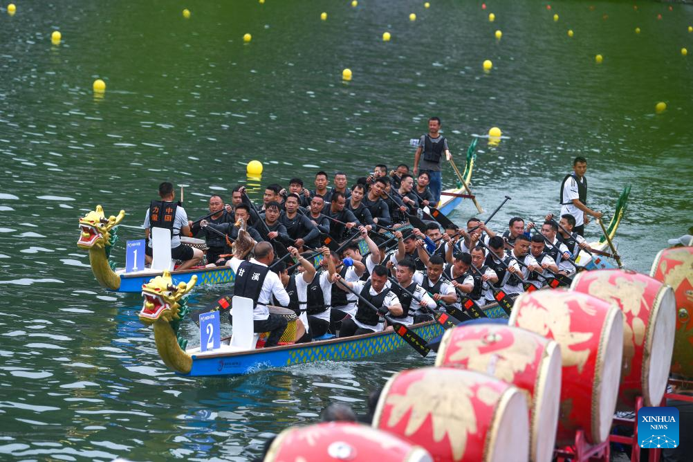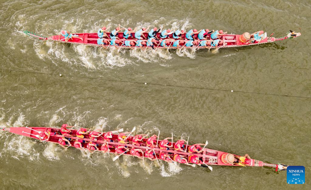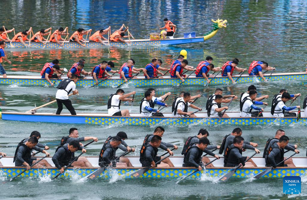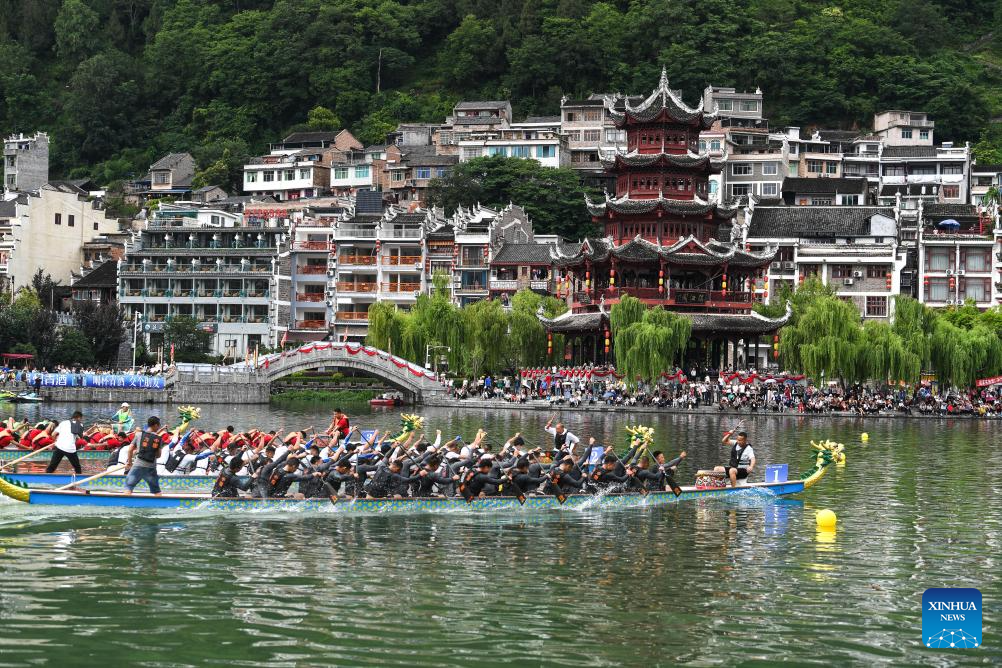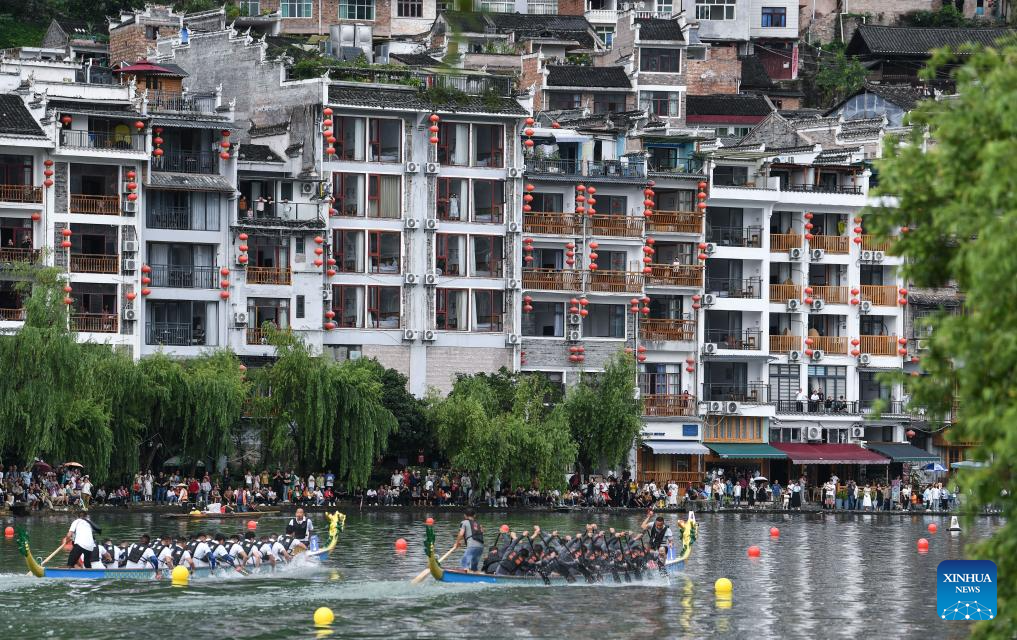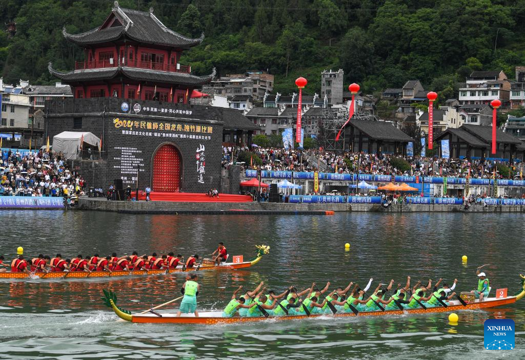 Contestants participate in a dragon boat race in Zhenyuan County of Qiandongnan Miao and Dong Autonomous Prefecture, southwest China's Guizhou Province, June 10, 2024. The Dragon Boat Festival, also known as Duanwu Festival, is a traditional holiday in China. It is celebrated on the fifth day of the fifth month of the Chinese lunar calendar and fell on Monday this year. (Xinhua/Yang Wenbin)