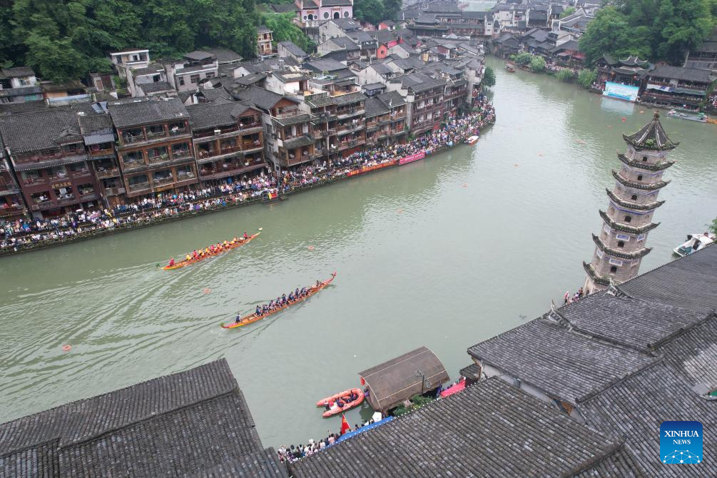An aerial drone photo shows a dragon boat race in the Fenghuang ancient town in Xiangxi Tujia and Miao Autonomous Prefecture, central China's Hunan Province, June 10, 2024. The Dragon Boat Festival, also known as Duanwu Festival, is a traditional holiday in China. It is celebrated on the fifth day of the fifth month of the Chinese lunar calendar and fell on Monday this year. (Photo by Peng Biao/Xinhua)