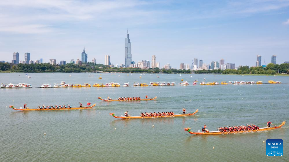 A drone photo shows a dragon boat race held on Xuanwu Lake in Nanjing, east China's Jiangsu Province, June 10, 2024. The Dragon Boat Festival, also known as Duanwu Festival, is a traditional holiday in China. It is celebrated on the fifth day of the fifth month of the Chinese lunar calendar and fell on Monday this year. (Photo by Su Yang/Xinhua)