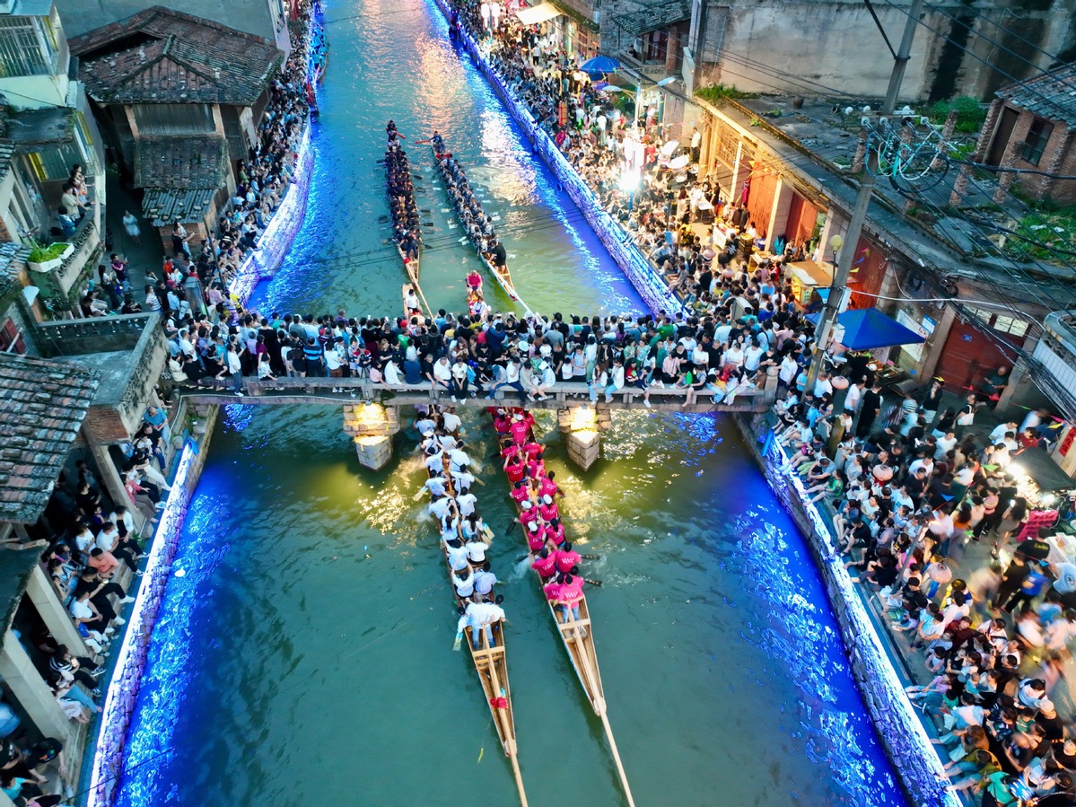 An aerial drone photo taken on June 9 shows a nighttime dragon boat race held to celebrate the Dragon Boat Festival in Sanxi village of Changle district, Fuzhou, capital of Southeast China's Fujian province. [Photo/Xinhua]