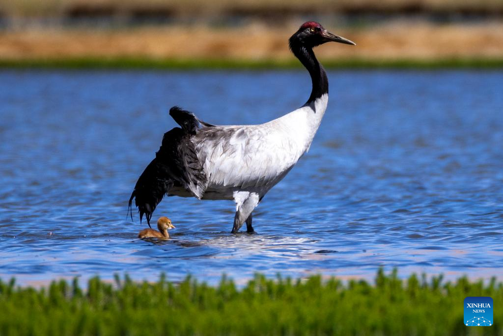 A black-necked crane and its baby are seen at a wetland in Xainza County of Nagqu City, southwest China's Xizang Autonomous Region, June 9, 2024. Black-necked crane couples are breeding babies in wetlands at an altitude of about 4,700 meters in Xainza County. Every year around the time of June, pairs of black-necked cranes migrate to Xainza County to hatch eggs on grass piers surrounded by water. The black-necked crane, a species under first-class state protection in China, mainly inhabits plateau meadows and marshes at an altitude of 2,500 to 5,000 meters. (Xinhua/Jigme Dorje)