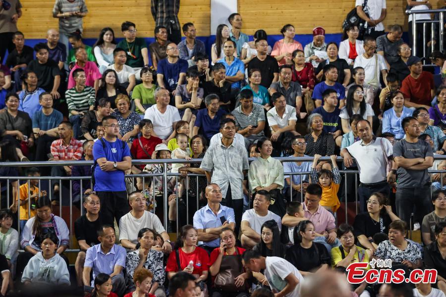 Members of the Banchao Team (red) compete with members of Qomolangma Snow Eagle Team in a friendly match in Rongjiang County, Qiandongnan Miao and Dong Autonomous Prefecture, Guizhou Province, June 10, 2024.(Photo: China News Service/ Qu Honglun)