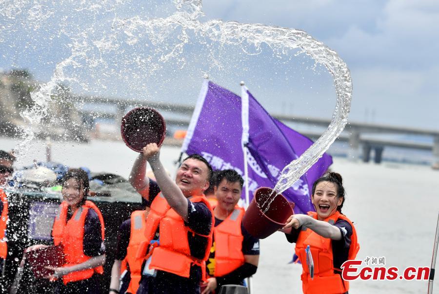 The people from both sides of the Taiwan Straits splash water on the sea to welcome the Dragon Boat Festival in Shishi, Quanzhou, Fujian province on the Dragon Boat Festival, June 10. (Photo: China News Service/ Lyu Ming)