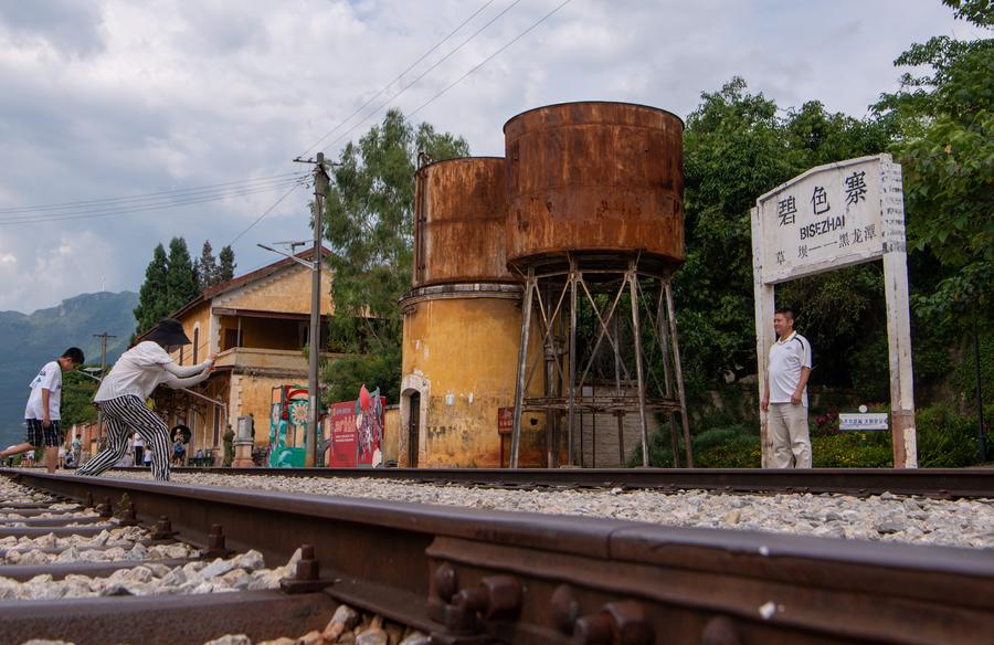 A tourist poses for photos at Bisezhai railway station in Mengzi City, southwest China's Yunnan Province, Aug. 9, 2022. (Xinhua/Jiang Wenyao)
