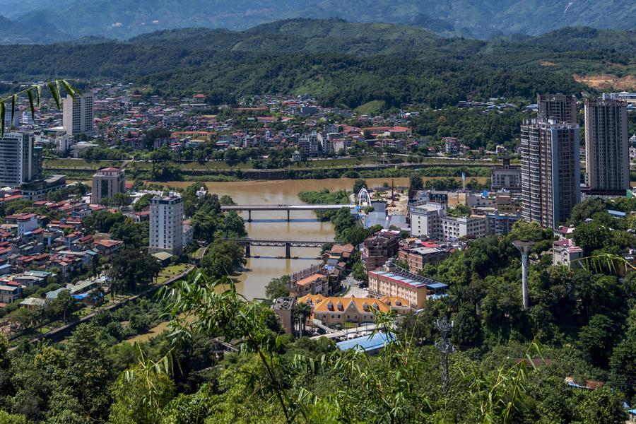 This photo taken on Sept. 10, 2021 shows railway (front) and expressway bridges linking Hekou Port (R) in Hekou County, southwest China's Yunnan Province and north Vietnam's Lao Cai Province. (Xinhua/Chen Xinbo)