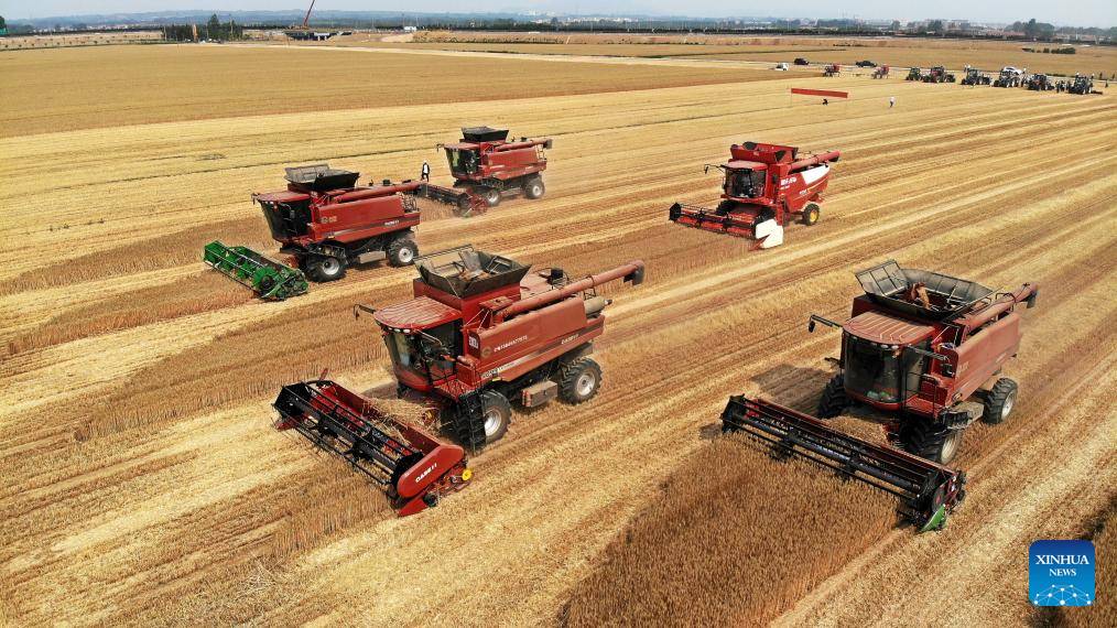 Combine harvesters reap wheat in a field in Dachang Town of Xihai'an (West Coast) New Area in Qingdao, east China's Shandong Province, June 11, 2024. In east China's Shandong Province, China's second-largest wheat-producing area, a variety of loss-cutting activities have been carried out in each county and city with wheat plantation areas exceeding 4 million hectares. Meanwhile, more than 1.5 million sets of agricultural machinery are joining in the harvest in Shandong. (Xinhua/Li Ziheng)