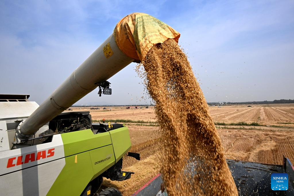 A combine harvester reaps wheat in a field in Dachang Town of Xihai'an (West Coast) New Area in Qingdao, east China's Shandong Province, June 11, 2024. In east China's Shandong Province, China's second-largest wheat-producing area, a variety of loss-cutting activities have been carried out in each county and city with wheat plantation areas exceeding 4 million hectares. Meanwhile, more than 1.5 million sets of agricultural machinery are joining in the harvest in Shandong. (Xinhua/Li Ziheng)