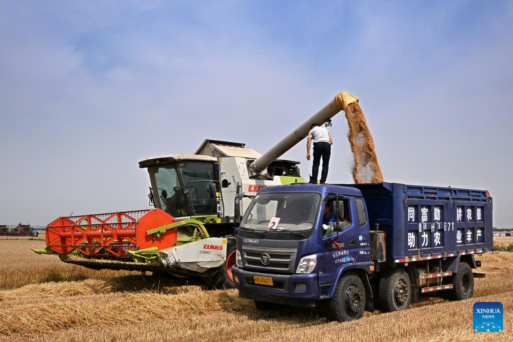 A combine harvester works in a wheat field in Dachang Town of Xihai'an (West Coast) New Area in Qingdao, east China's Shandong Province, June 11, 2024. In east China's Shandong Province, China's second-largest wheat-producing area, a variety of loss-cutting activities have been carried out in each county and city with wheat plantation areas exceeding 4 million hectares. Meanwhile, more than 1.5 million sets of agricultural machinery are joining in the harvest in Shandong. (Xinhua/Li Ziheng)