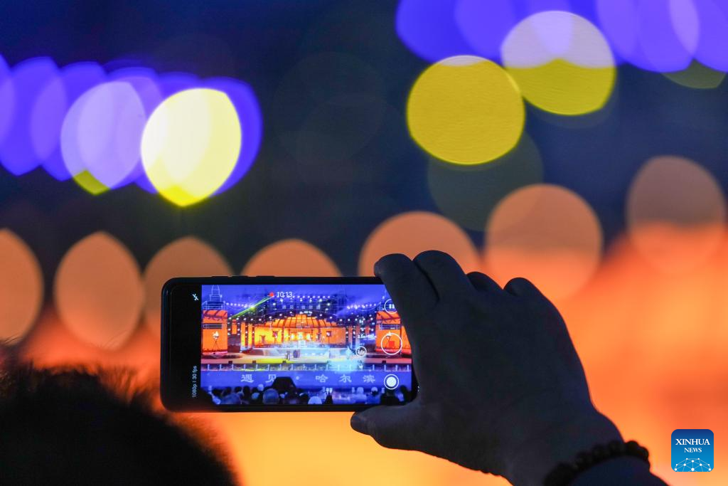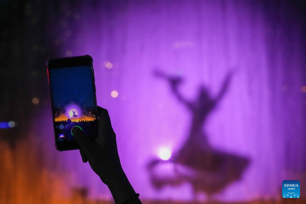 An audience shoots a video of the live-action performance "Encounter Harbin" staged at Sun Island scenic spot in Harbin, northeast China's Heilongjiang Province, June 10, 2024. (Xinhua/Wang Jianwei)