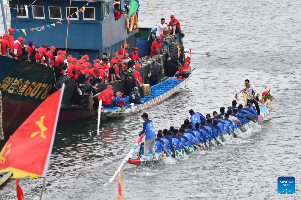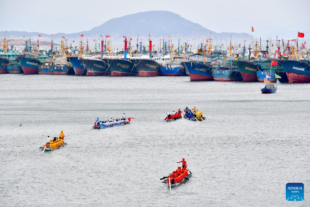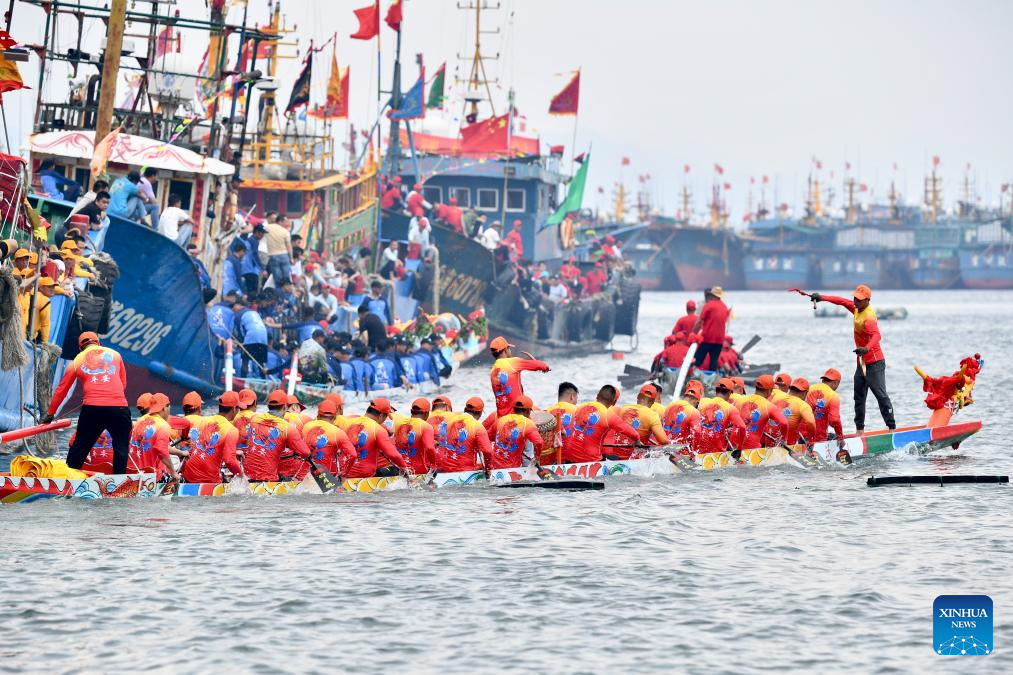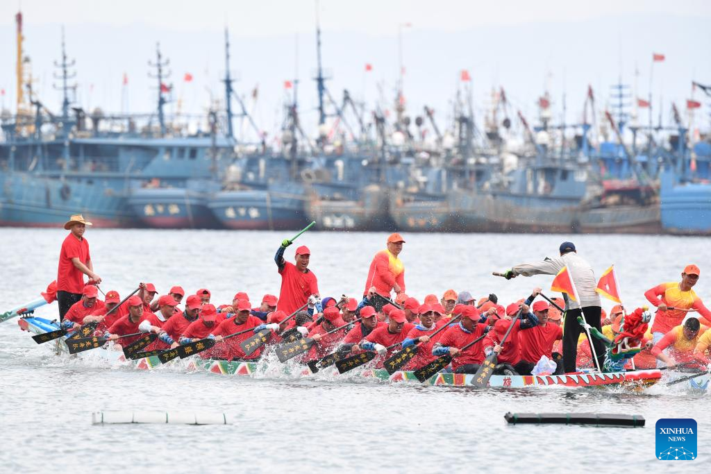 Contestants participate in a dragon boat race at a fishing port in Lianjiang County, southeast China's Fujian Province, June 11, 2024. The dragon boat race at sea has a long history in Lianjiang. The eight-day event from the first day of the fifth month of the Chinese lunar calendar has become a well-known cultural activity to celebrate the Dragon Boat Festival, also called Duanwu Festival. (Xinhua/Jiang Kehong)