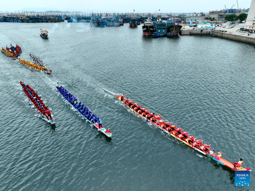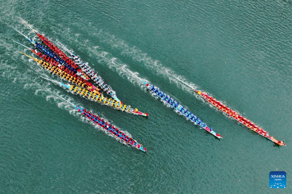 An aerial drone photo shows contestants participating in a dragon boat race at a fishing port in Lianjiang County, southeast China's Fujian Province, June 11, 2024. The dragon boat race at sea has a long history in Lianjiang. The eight-day event from the first day of the fifth month of the Chinese lunar calendar has become a well-known cultural activity to celebrate the Dragon Boat Festival, also called Duanwu Festival. (Xinhua/Jiang Kehong)