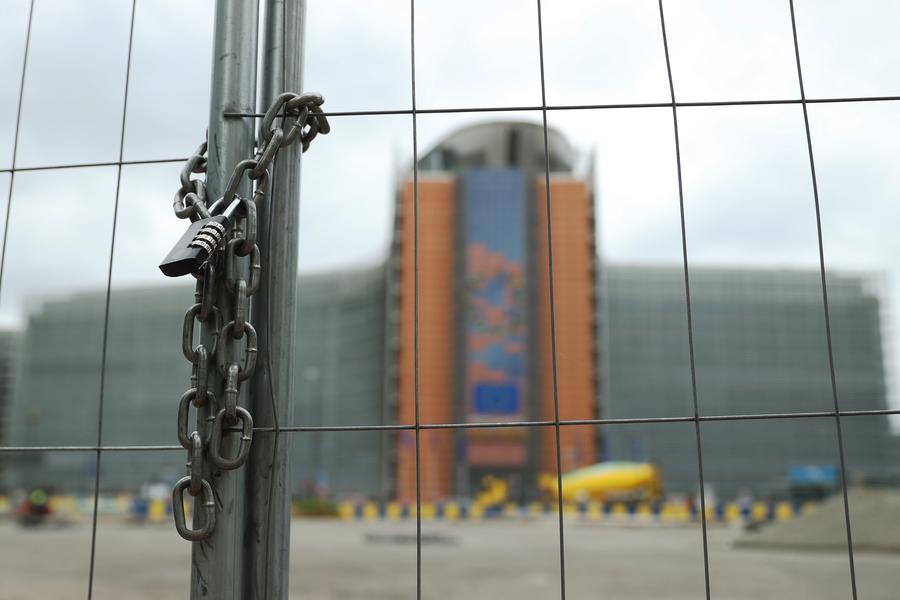This file photo taken on June 3, 2024 shows a lock on chains backdropped by the European Commission building in Brussels, Belgium. The European Commission on Wednesday issued a statement to pre-disclose the level of protectionist provisional duties it would impose on imports of battery electric vehicles (EVs) from China. (Xinhua/Zhao Dingzhe)