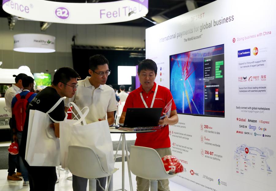 Visitors and an exhibitor communicate during the AliExpo 2024 in Sydney, Australia, March 15, 2024. (Xinhua/Ma Ping)