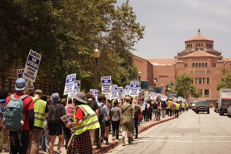Academic workers protest at the University of California (UC), Los Angeles, in Los Angeles, California, the United States, on May 28, 2024. (Photo by Zeng Hui/Xinhua)