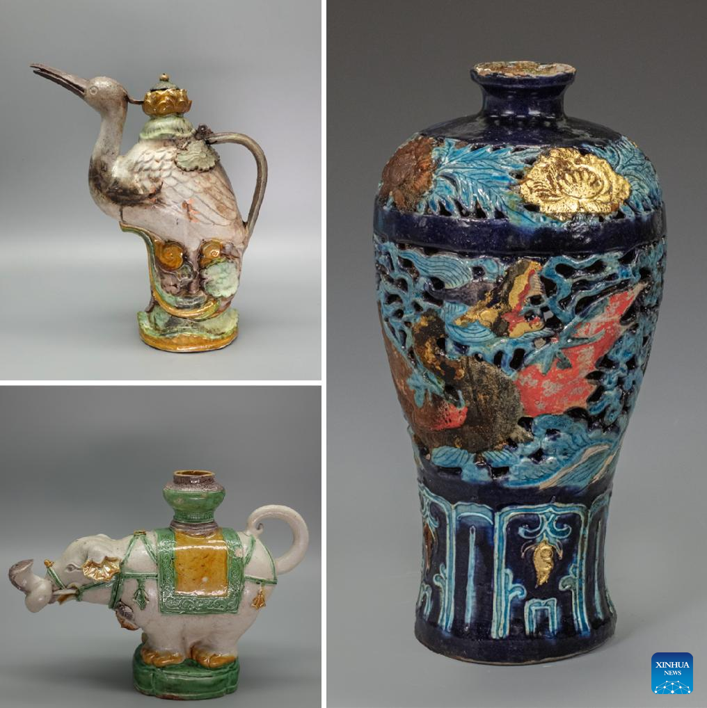 This undated combo photo shows pieces of cultural relics retrieved from two ancient shipwrecks discovered in the South China Sea. More than 900 pieces of cultural relics have been retrieved from two ancient shipwrecks discovered in the South China Sea, the National Cultural Heritage Administration (NCHA) said Thursday. (NCHA/Handout via Xinhua)