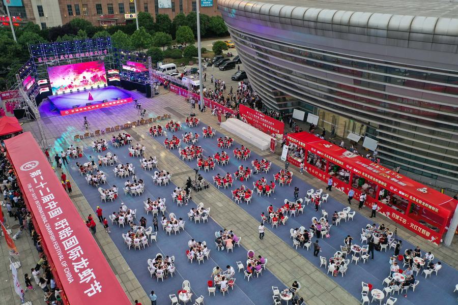 Aerial photo taken on June 12, 2022 shows people enjoying crayfish dishes during an international crayfish festival in Xuyi County of Huai'an, east China's Jiangsu Province. (Xinhua/Ji Chunpeng)