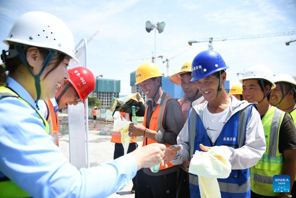 A worker distributes heat prevention supplies to outdoor workers at a construction site in Xi'an, northwest China's Shaanxi Province, June 13, 2024. During the hot summer days, local organizations in Xi'an have sent watermelons, bottled water, and other cooling supplies to outdoor workers. (Xinhua/Zhang Bowen)