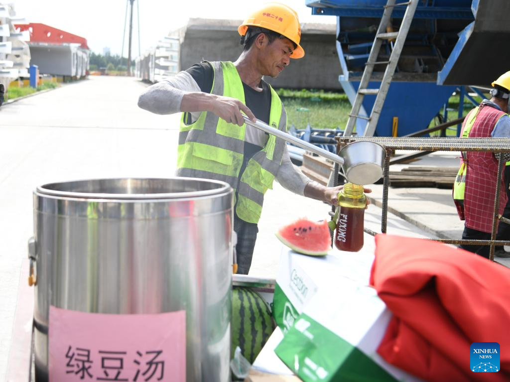 An outdoor worker takes mung bean soup at a construction site in Baqiao District of Xi'an, northwest China's Shaanxi Province, June 12, 2024. During the hot summer days, local organizations in Xi'an have sent watermelons, bottled water, and other cooling supplies to outdoor workers. (Xinhua/Zhang Bowen)