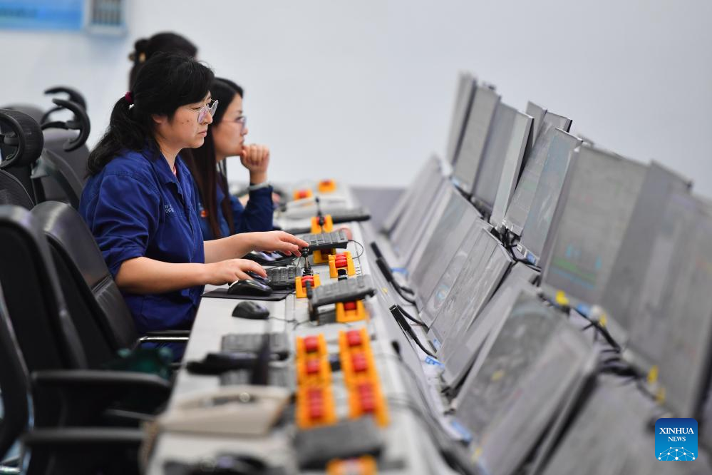 Workers operate equipment remotely at an intelligent center of an iron and steel factory in Xiangtan, central China's Hunan Province, June 13, 2024. With the application of technologies such as 5G and BeiDou Navigation Satellite System, the intelligent level of traditional industries in China's central region has been upgraded in recent years. (Xinhua/Chen Zeguo)