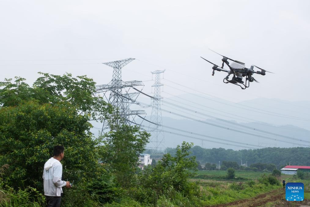 An operator controls a drone for seeding at a field in Taogang Township of Huangshi, central China's Hubei Province, June 6, 2024. With the application of technologies such as 5G and BeiDou Navigation Satellite System, the intelligent level of traditional industries in China's central region has been upgraded in recent years. (Xinhua/Wu Zhizun)