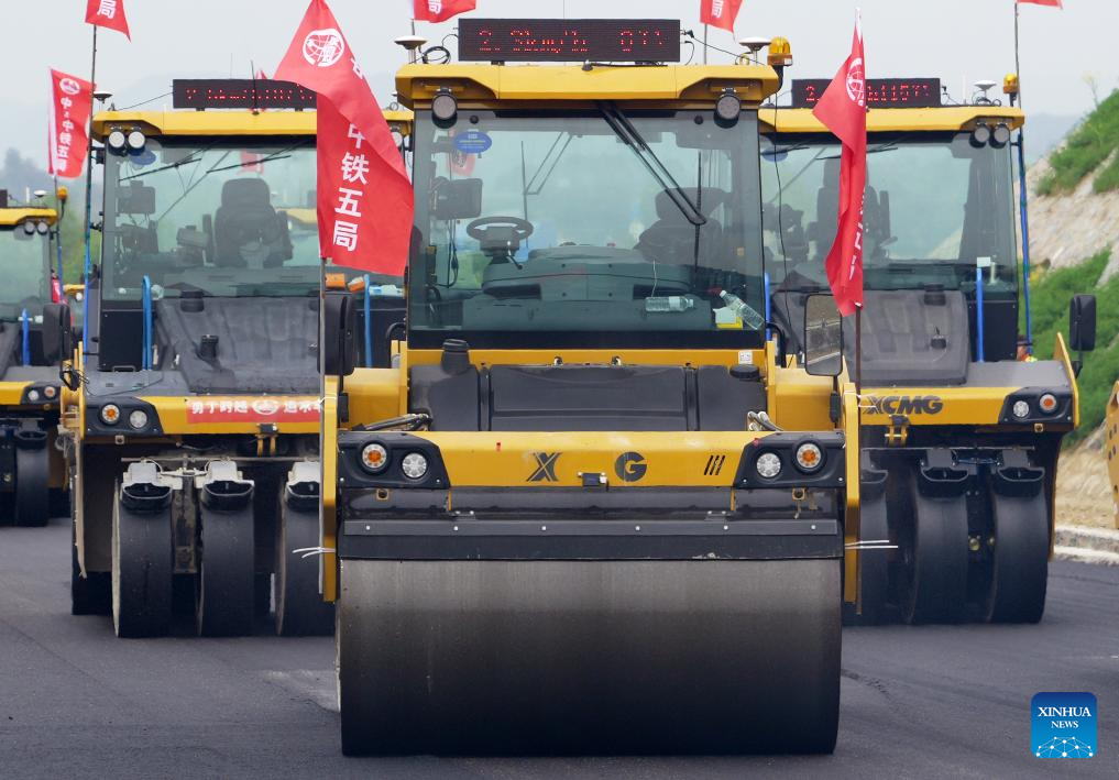 Automated road rollers operate at the construction site of an expressway in Xinxian County, central China's Henan Province, April 11, 2024. With the application of technologies such as 5G and BeiDou Navigation Satellite System, the intelligent level of traditional industries in China's central region has been upgraded in recent years. (Xinhua/Li Jianan)