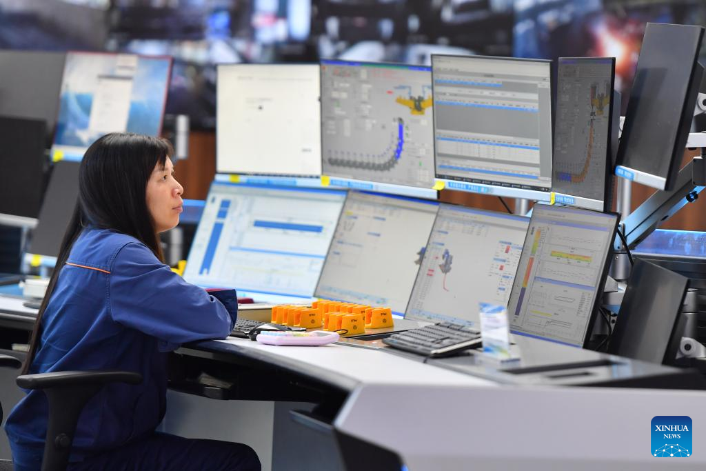 A worker operates casting equipment remotely at an intelligent center of an iron and steel factory in Xiangtan, central China's Hunan Province, June 13, 2024. With the application of technologies such as 5G and BeiDou Navigation Satellite System, the intelligent level of traditional industries in China's central region has been upgraded in recent years. (Xinhua/Chen Zeguo)