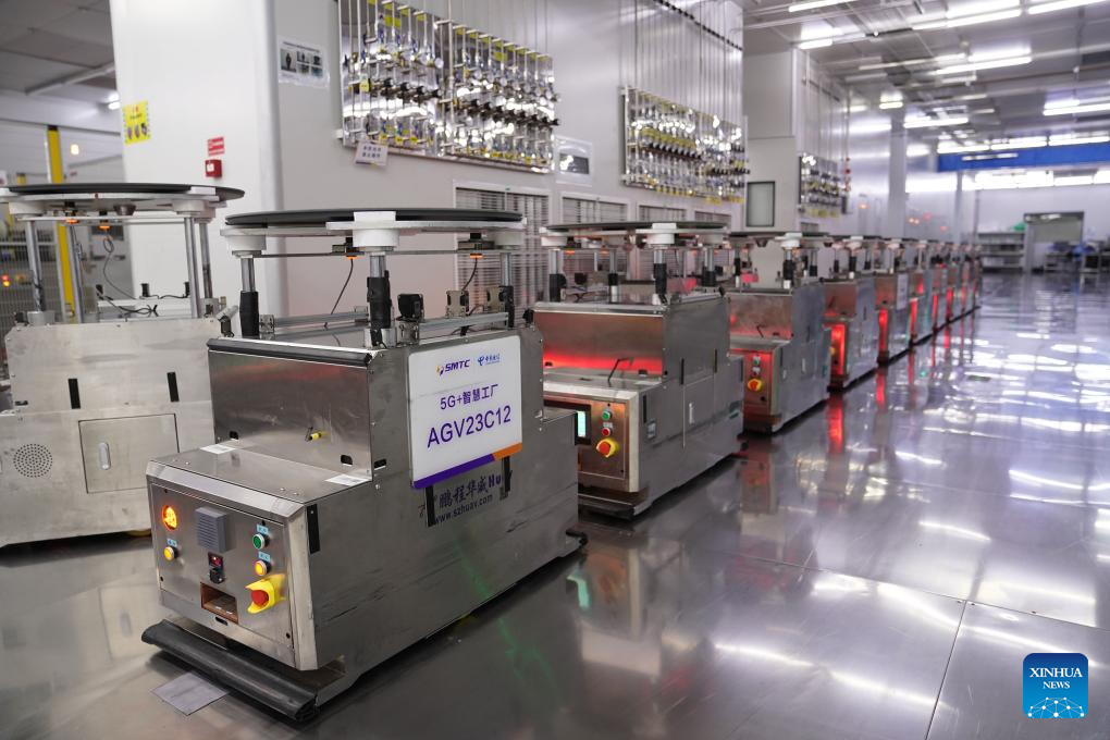 An AGV (automated guided vehicle) conducts transporting operations automatically at a workshop in Nanchang of China's Jiangxi Province, June 4, 2024. With the application of technologies such as 5G and BeiDou Navigation Satellite System, the intelligent level of traditional industries in China's central region has been upgraded in recent years. (Xinhua/Zhou Mi)
