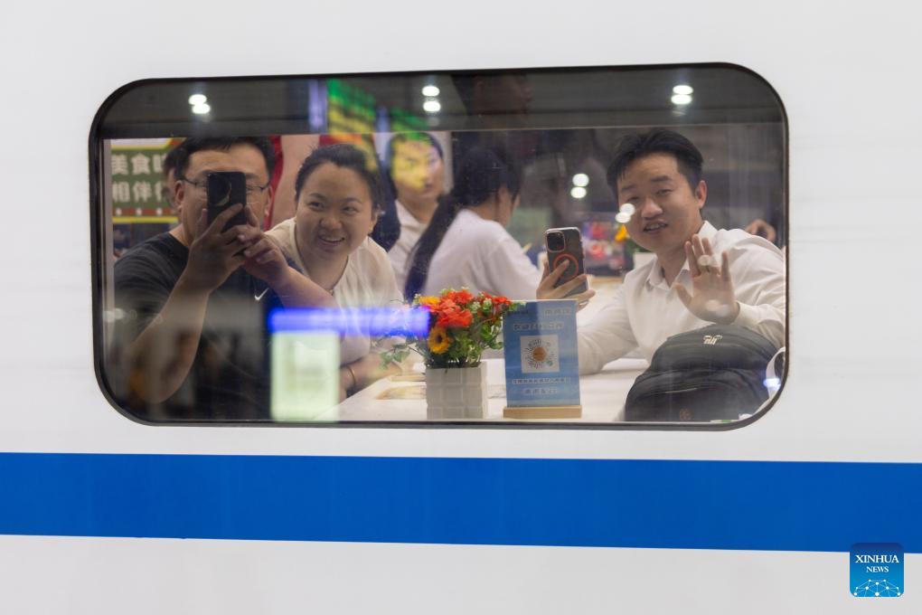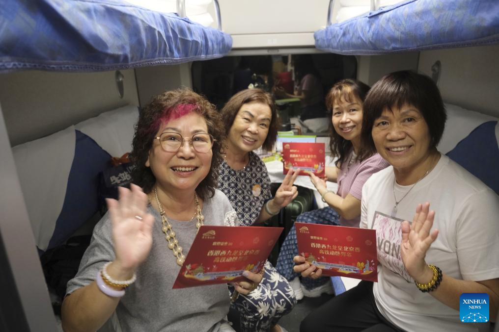 Passengers taking the high-speed sleeper train D910 bound for Beijing West Railway Station pose for a selfie at Hong Kong's West Kowloon Station in Hong Kong, south China, June 15, 2024. High-speed sleeper trains linking Beijing and Shanghai with Hong Kong commenced operations on Saturday.