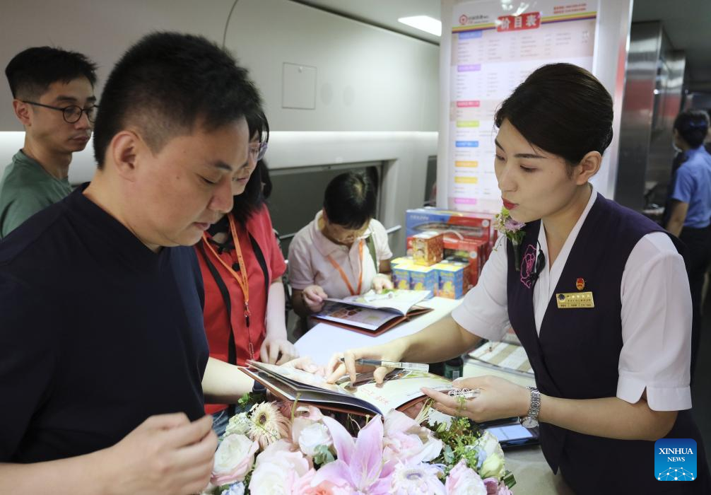 Staff members present gifts to passengers taking the high-speed sleeper train D907 bound for Hong Kong's West Kowloon Station at Shanghai Hongqiao Railway Station in east China's Shanghai, June 15, 2024. High-speed sleeper trains linking Beijing and Shanghai with Hong Kong commenced operations on Saturday.