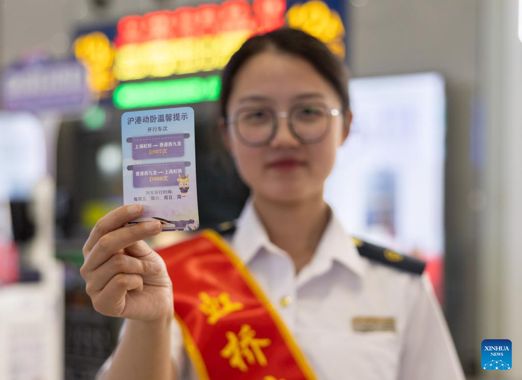 A staff member displays a reminder card of the high-speed sleeper trains D907 and D908 between Shanghai and Hong Kong, at Shanghai Hongqiao Railway Station in east China's Shanghai, June 15, 2024. High-speed sleeper trains linking Beijing and Shanghai with Hong Kong commenced operations on Saturday.