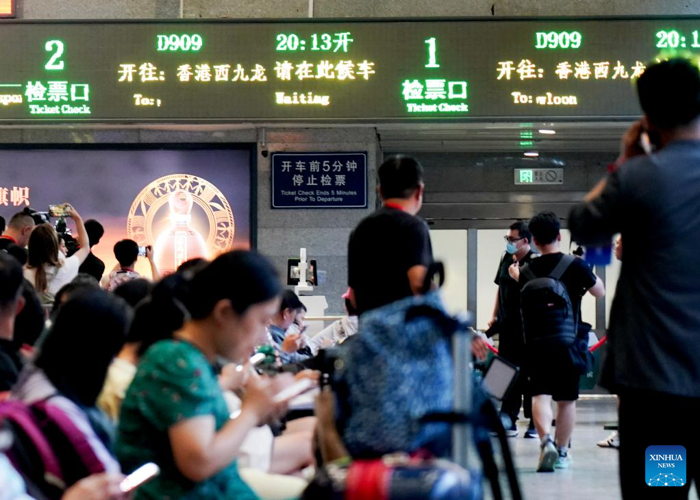 Passengers boarding the high-speed sleeper train D907 bound for Hong Kong's West Kowloon Station wait for the departure at Shanghai Hongqiao Railway Station in east China's Shanghai, June 15, 2024. High-speed sleeper trains linking Beijing and Shanghai with Hong Kong commenced operations on Saturday.
